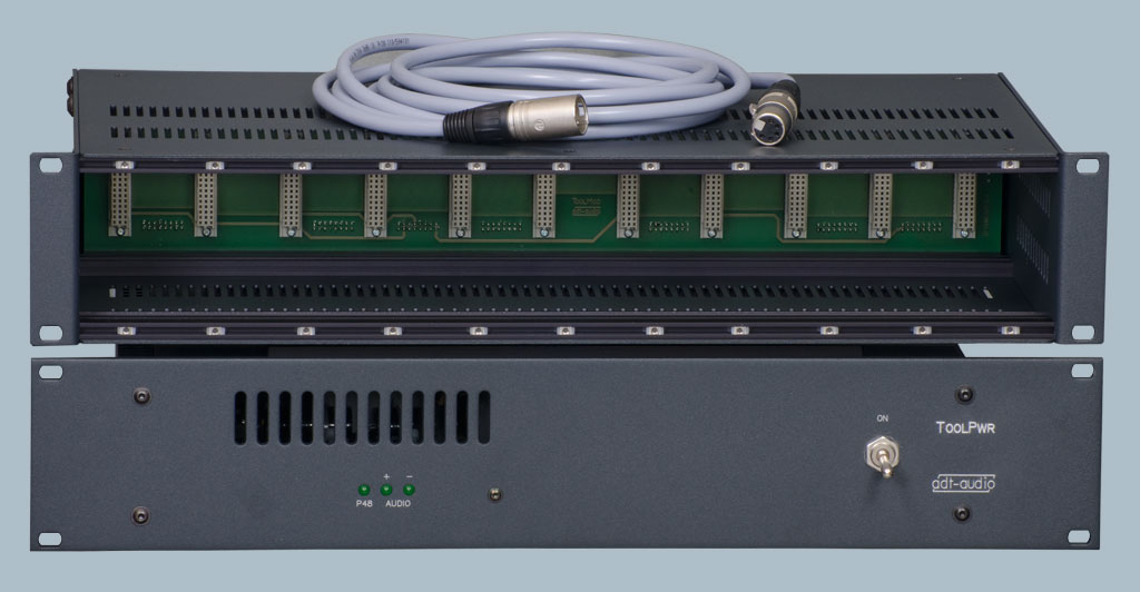 Das Netzgerät ToolPwr-E hat eine für acht bis neun Höheneinheiten ausreichende Kapazität. Umfangreiche Erweiterungen und kombinierte Anlagen mit ToolMod-Rahmen, ToolMix Summierern und ToolKit Channel Strips können mit diesem Netzgerät versorgt werden. Wieviele Module bzw. Tool-Geräte mit einem Netzgerät versorgt werden können, hängt von der Stromaufnahme der bestückten Module ab.