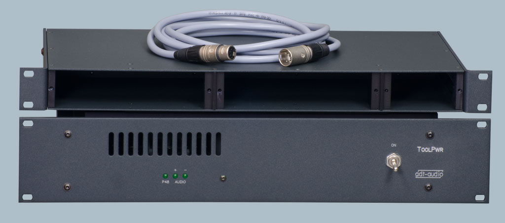 Im Lieferumfang enthalten sind der 1HE ToolMod Rahmen, ein Netzgerät ToolPwr-E und ein Netzteilkabel mit 3 m Länge für die Verbindung zwischen Netzgerät und ToolMod Rahmen. Durch das leistungsfähige Netzgerät ToolPwr-E kann dieses Starter-Kit um 7 bis 8 1HE-Rahmen oder andere Tool-Geräte von adt-audio erweitert werden, ohne dass ein zweites Netzgerät erforderlich ist.