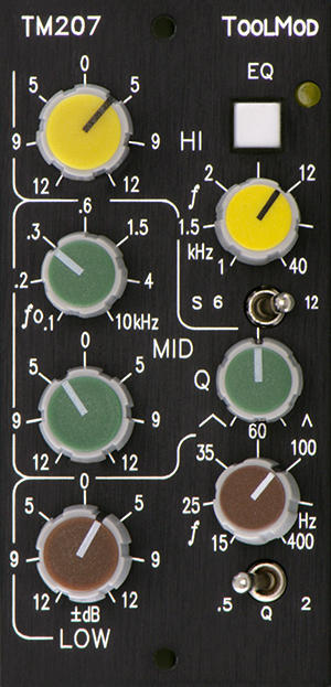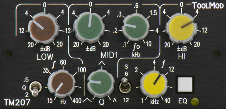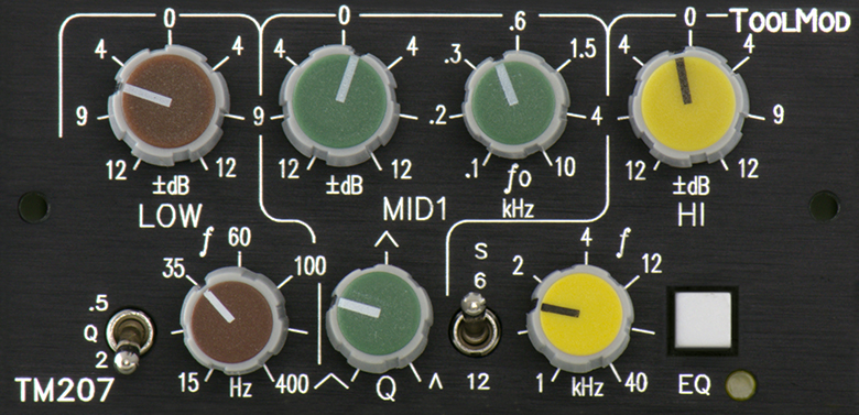 Die Stereo-Version des 'kleinen' ToolMod Equalizers TM107 kombiniert ein vollparametrisches Mittenband auf Basis der aktiven Wien-Brücke von adt-audio, einen als Shelving-Filter ausgeführten Höhen Equalizer mit regelbarer Auslauf-Frequenz und umschaltbarer Flankensteilheit und ein als Glockenfilter, ebenfalls auf Basis eines aktiven Wien-Brücken Filters aufgebauten Low Equalizer mit regelbarer Mittenfrequenz und umschaltbarer Filtergüte.