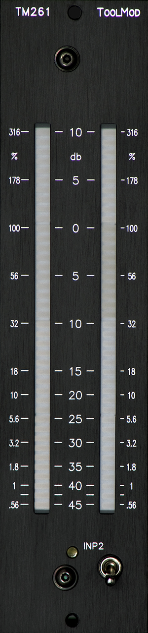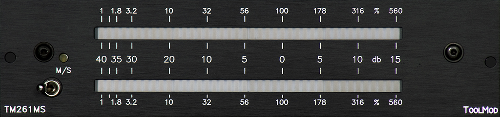 Außerdem kann zwischen den Einschwingzeiten 'Fast', 'PCM' und 'IRT' gewählt werden. Das Modul hat zwei symmetrische, hochohmige Stereo-Eingänge. Die Anwahl des aktiven Eingangs erfolgt durch einen Kippschalter auf der Frontplatte. In der Version 'MS' ist nur ein Stereo-Eingang vorhanden, der durch den Kippschalter auf die Anzeige von M und S umgeschaltet werden kann.