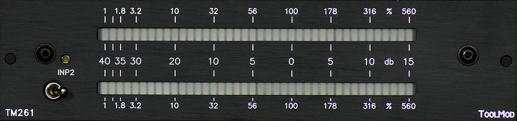 Das analoge Stereo Peakmeter TM261 ist in verschiedenen Ausführungen lieferbar. Der Anzeigebereich der Standardausführung reicht von + 15 dB bis -40 dB. Alternativ ist eine Ausführung mit einer Skala von + 10 dB bis -45 dB lieferbar.