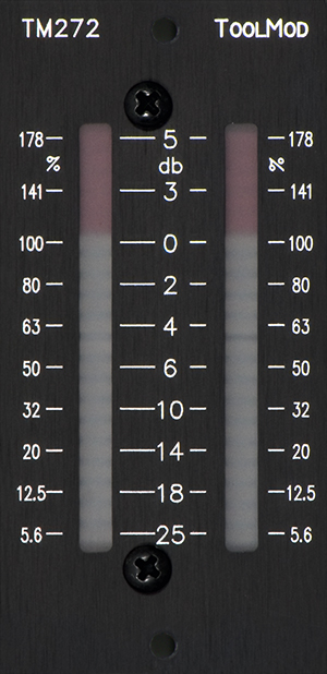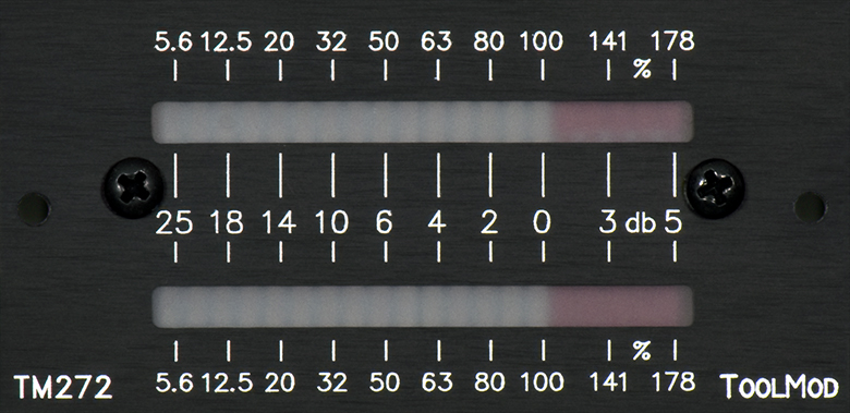 Das kompakte, analoge Stereo LED-VU-Meter TM272 benutzt das gleiche Display mit 20 Leuchtdioden wie das Stereo Peakmeter TM271, jedoch sind der Skalenverlauf und die Ein- und Ausschwingzeiten der Anzeige eines üblichen VU-Meters angepasst. Damit ergibt sich eine aussagekräftige, auf die Lautheit bezogene Anzeige des Pegels.