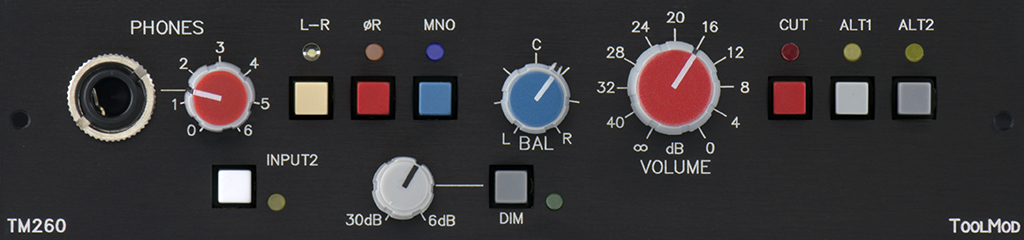 Im Abhörregler TM260 sind alle Funktionen zusammengefasst, die für die Steuerung der Abhöranlagen im Regieraum wichtig sind. Das Modul arbeitet völlig neutral und hat keinen 'Eigensound'. Die symmetrischen Eingänge sind sehr hochohmig ausgeführt, sodass die angewählten Quellen nicht belastet werden. Durch den Headroom von + 30 dBu und den Dynamikbereich von mehr als 124 dB RMS bzw. 127 dBA ist der TM260 mit jeder Art von Quellen und Abhörsystemen problemlos einsetzbar.