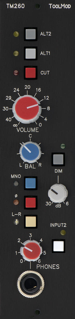 Der Abhörregler TM260b ist alternativ lleferbar. Dieses Modul hat die gleichen Features, ist aber zusätzlich mit einer getrennten Verstärkungsregelung für den zweiten Eingang ausgestattet.