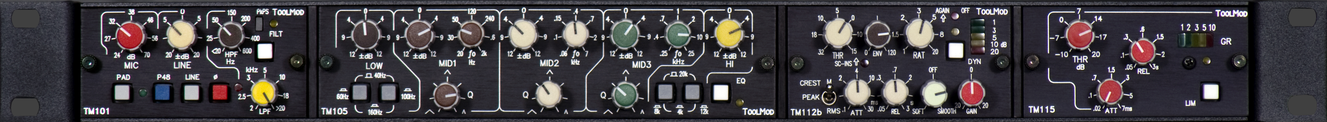 Toolmod Channel-Strip mit Mic-Pre, 5-Band-EQ, Compressor und Limiter mit TM101 Mikrofonverstärker mit Übertrager, TM105 5-Band-EQ, TM112b Compresso und TM115 Limiter